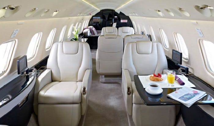 Le jet privé de 10 places a une cabine spacieuse idéale pour transporter vos bagages et vos skis, des sièges confortables et du champagne servi à bord.
