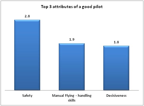 - Sans surprise, presque tous les pilotes, tous secteurs confondus, ont mis l'accent sur la sécurité (« La sécurité — en faire sa principale priorité quelles que soient les pressions commerciales »). 81 % des pilotes ayant choisi cette qualité en premier, elle a reçu une note moyenne de 2,8/3.