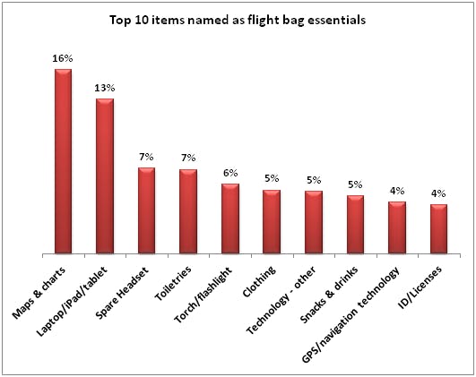 - La technologie n'en reste pas moins importante aux yeux de nos pilotes : 13 % emportent toujours avec eux un ordinateur portable ou une tablette numérique. 5 % ne voyagent pas sans un GPS et 5 % mentionnent d'autres gadgets comme un iPod, un adaptateur ou une liseuse électronique dans leur liste d'essentiels.