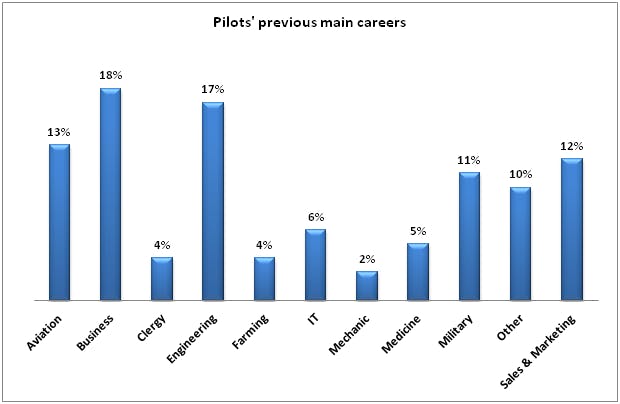 - 18 % des pilotes ayant travaillé dans d'autres domaines ont occupé des fonctions à responsabilité, soit en tant que chef d'entreprise, soit en tant que cadre supérieur. 12 % ont travaillé dans les ventes ou le marketing et 6 % en informatique. Beaucoup sont d’anciens ingénieurs (17 %). 13 % sont devenus pilotes après avoir exercé un métier en lien avec l'aviation : personnel au sol ou agent de bord. 11 % sont d'anciens militaires (non-pilotes).
