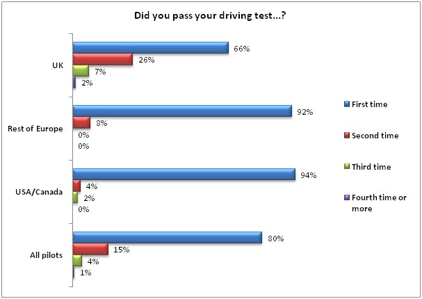 - Au Royaume-Uni, où l'examen est réputé plus difficile qu'ailleurs, une part plus faible de notre échantillon (66 %) est parvenue à obtenir son permis de conduire dès le premier essai. Ce qui représente toutefois un taux de réussite supérieur à l'ensemble de la population britannique (46 %). 26 % des pilotes anglais ont obtenu leur permis de conduite après deux tentatives, 7 % après trois et seulement 2 % après quatre ou plus. Dans le reste du monde, aucun pilote n'a eu besoin de passer l'examen du permis de conduire à plus de trois reprises.