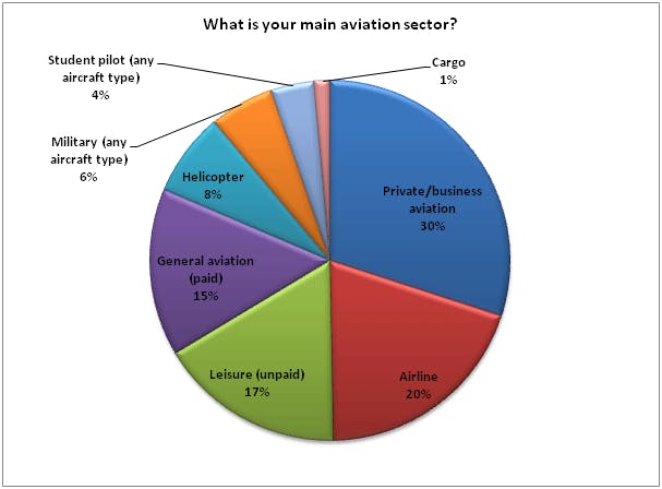 - Les pilotes ont été interrogés sur leur principal secteur d'activité : 30 % travaillent pour l'aviation privée/d'affaires et 20 % pour les compagnies aériennes. 15 % sont employés dans l'aviation générale, en tant qu'instructeurs ou examinateurs par exemple.