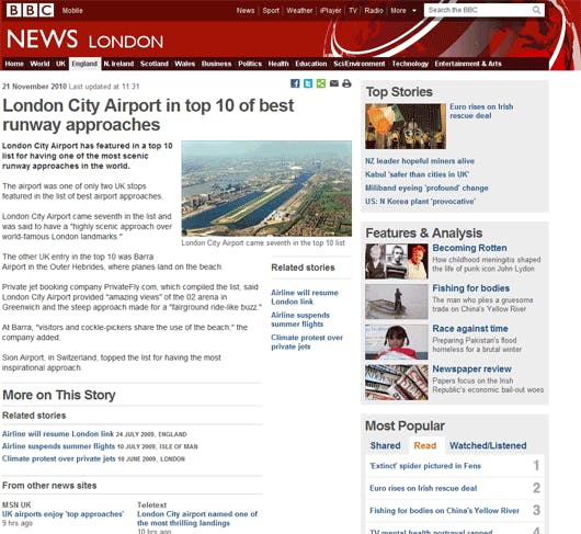 London City Airport has featured in a top 10 list for having one of the most scenic runway approaches in the world. The airport was one of only two UK stops featured in the list of best airport approaches(read full news story)