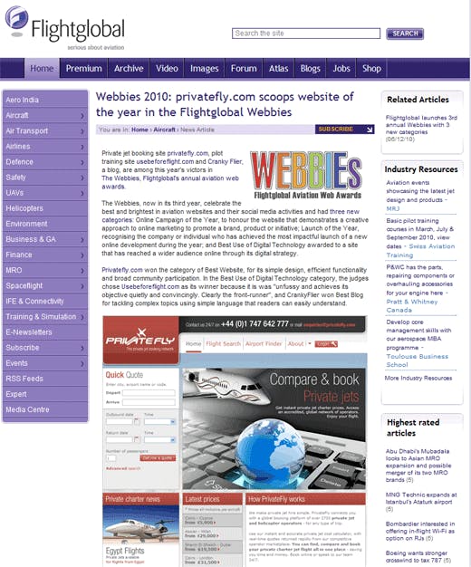 Flightglobal Webbies 2010: PrivateFly.com scoops website of the year