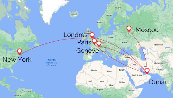 *Les vols EuroPairs doivent être réservés avec un préavis d'au moins 14 jours pour bénéficier des tarifs indiqués ci-dessus. Les prix sont valables pour un aller simple entre les villes indiquées (dans un sens ou dans un autre), un devis pour le retour peut vous être envoyé sur demande. Les vols peuvent être directs ou avec une escale de ravitaillement, selon la disponibilité des appareils. Prix basés sur un maximum de 6 passagers (Dubai) et 8 passagers (Londres - New York). Pour tout groupe avec un nombre de voyageurs plus élevé, un devis peut vous être envoyé sur demande. La restauration VIP à bord est incluse. Un supplément pourra être appliqué si vous souhaitez choisir un aéroport spécifique à Londres ou New York, notamment pour les aéroports de London Heathrow, London Gatwick et New York JFK qui sont sujets à une surtaxe. Prix valables jusqu'au 30 avril 2021.