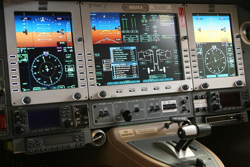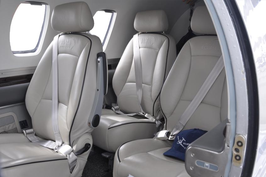 La cabine de l'Eclipse 500 est insonorisée et dotée de quatre fauteuils en cuir de style club, d'un éclairage LED, de tables escamotables et de plusieurs prises de courant.